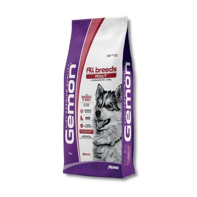 GEMON ALL BREEDS ADULT WITH BEEF AND RICE is a complete feed for adult dogs of all breeds and sizes. The composition is characterised by high-quality ingredients such as beef, a source of essential nutrients, and rice, a source of carbohydrates. Thanks to the extrusion process, the recipe is highly digestible. A balanced diet with prebiotics such as fructo-oligosaccharides (FOS), and beet pulp, a source of insoluble fibres to support regular bowel function. Contains fresh meat for optimal palatability, and glucosamine and chondroitin sulphate to support joints and bones. Additionally, it contains brewer's yeast to help maintain a full and soft coat. Without added artificial colours and preservatives.