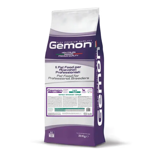 GEMON High Premium Quality light dog food with chicken and rice is a complete food for adult dogs of all sizes. Specially developed for dogs with overweight. Ideal for medium and large adult dogs. A lower calorie content supports the maintenance/achievement of an optimal body weight. Easily digestible ingredients aid easier digestion. Chicken meat is rich in good proteins and amino acids. A natural source of chondroitin, which keeps joints supple and maintains healthy cartilage. Vitamins and minerals strengthen dogs' immune systems. FOS prebiotics promote the growth of bacteria in the digestive system, ensuring healthy digestion and also helping to regulate metabolic processes. It contains all the nutrients a normally active adult dog requires.