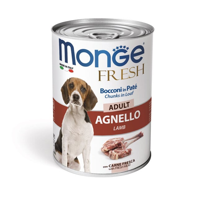 Monge Natural Superpremium Dog Food Adult Pâté with Lamb Chunks is wet dog food for adult dogs of all breeds. It is part of the Monge Fresh product line. This wet dog food is a pâté formulated with a unique animal protein source, high-quality lamb. The products are highly palatable and 100% sourced from Italy. This wet dog food provides a balanced diet with complex vitamins and micronutrients. The dog pâté contains no preservatives, colourings, or added sugars. The recommended daily portion may be divided into three meals. Should our wet dog food replace another type of food or diet, it is advisable to introduce it gradually over a period of 1 week. Please store our wet dog food in a cool and dry place. Once opened, it can be kept in the refrigerator for up to 3 days.
