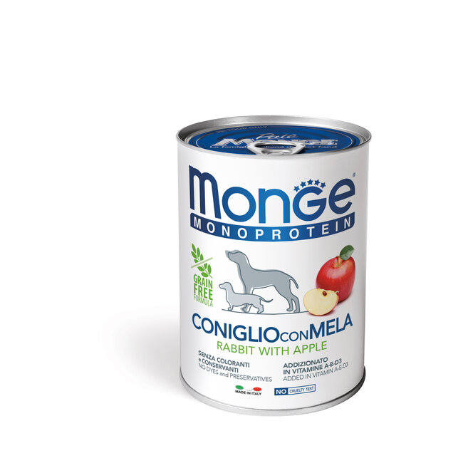 Monge Natural Superpremium – Dog Food Monoprotein Pâté 100% Rabbit with Apple - 400g is a pâté for dogs of all breeds. This dog pâté is part of the Monge Wet product line. The dog pâté contains a single animal protein source, high-quality rabbit. The addition of fruit provides a natural source of minerals and vitamins. The products are highly palatable and 100% sourced from Italy. Monge Wet dog pâté is a balanced food with complex vitamins and micronutrients. The dog pâté contains no preservatives, colourings, or added sugars.