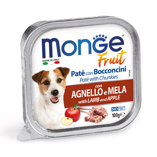 Monge Fruit Dog Food Pâté with Chunks of Fresh Lamb and Apple is a complete wet food for adult dogs. This wet dog food is part of the Monge Fruit product line. The wet dog food is highly digestible and very healthy. This wet dog food has been formulated as a balanced diet for adult dogs of all breeds. It is a soft and palatable dog pâté with chunks of fresh lamb as a protein source. The addition of fruit provides a source of minerals and vitamins. This wet dog food has a firm texture and a pleasant aroma. Monge Fruit wet dog food, premium quality wet food, healthy and very tasty!