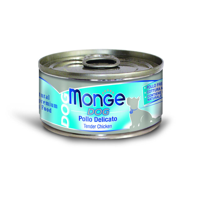 Monge Natural Superpremium Dog Food Tender Chicken Pieces – Oven-Cooked is a complementary wet dog food for adult dogs. This wet dog food consists of soft and tasty chicken pieces, prepared in the oven. A true indulgence for the palate of your beloved canine companion! A delicious wet dog food recipe without added preservatives or colourings. This wet dog food product is entirely gluten-free dog food. For a healthy adult dog weighing between 1 and 5 kg, we recommend using between 1 and 3 cans of dog food per day. For dogs weighing between 5 and 10 kg, you may use 3 to 5 cans. For large dogs, our wet dog food can be used as a special treat. It is recommended to combine our wet dog food with Monge Natural Superpremium Dry Dog Food for a complete daily diet. Serve our wet dog food at room temperature or warmed. Gluten-free wet dog food.