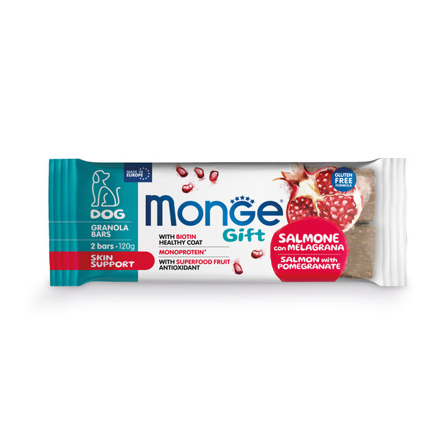 Monge Gift Dog Snacks Granola Bar Sensitive Skin Adult Salmon with Pomegranate is a healthy dog snack for adult dogs of all breeds. It serves as an excellent complement to Monge dog food. These healthy dog biscuits have been specially developed for your dog's well-being and for the maintenance of lean muscle mass. The healthy dog biscuits are a form of grain-free dog snacks with a single animal protein source, salmon. This provides a source of highly digestible and valuable proteins. The recipe for these healthy dog biscuits is further enriched with ingredients full of vitamins and minerals, which promotes your dog's vitality and contributes to a shiny and thick coat. The addition of the superfood fruit, pomegranate, provides antioxidants to support your dog's skin. These healthy dog biscuits are the result of Italian research aimed at improving the quality of life for dogs. No added artificial colours or sugars.