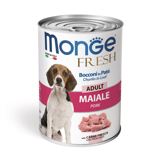 Monge Natural Superpremium Dog Food Adult Pâté with Pork Chunks is wet dog food for adult dogs of all breeds. It is part of the Monge Fresh product line. This wet dog food is a pâté formulated with a unique animal protein source, high-quality pork. The products are highly palatable and 100% sourced from Italy. This wet dog food provides a balanced diet with complex vitamins and micronutrients. It contains no preservatives, colourings, or added sugars. The recommended daily portion can be divided into three meals. When our wet dog food replaces another type of food or diet, it is advisable to introduce it gradually over a period of 1 week. Please store our wet dog food in a cool and dry place. Once opened, it can be kept in the refrigerator for up to 3 days.